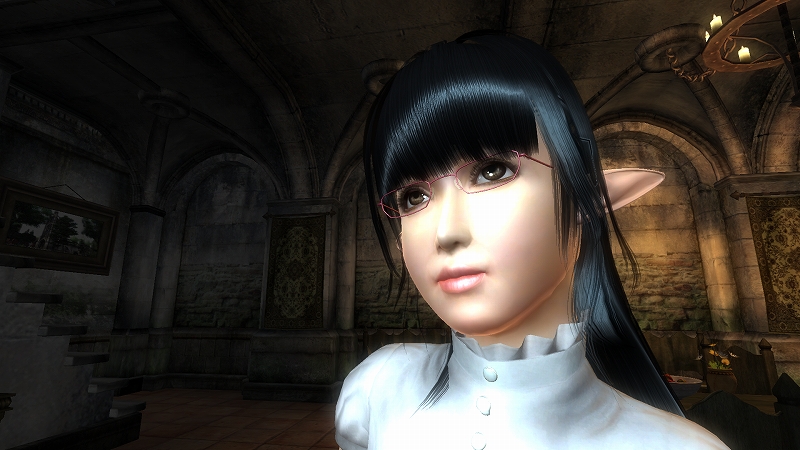 Dwemer Spectacles(海外サイト)というMODに入っていた金縁眼鏡のテクスチャを変更して、ついでにレンズを外しました。レンズがあると、レンズ越しに見える目の睫毛が消えてしまうので外しました。